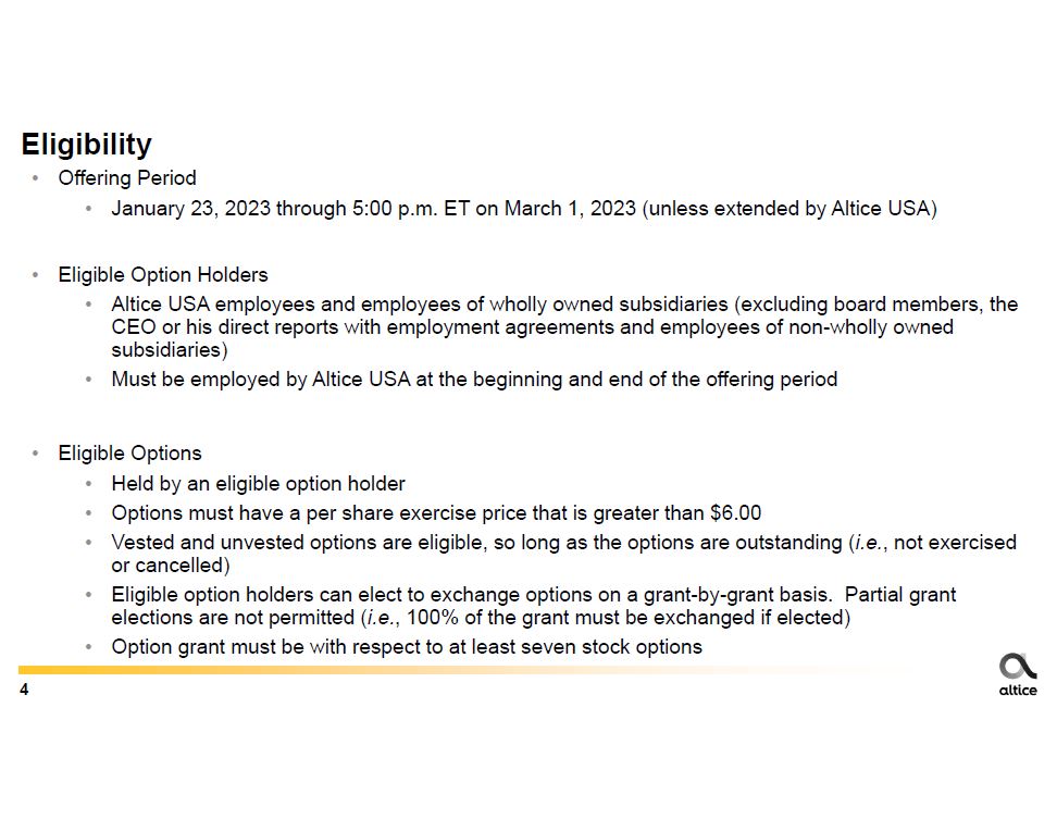 Making Your Elections Overview 5. You can now proceed with making your elections on the election form on the exchange offer website. All elections must be made on a grant-by-grant basis. Exchange Offer Commencement Date: January 23, 2023 Expiration Time: March 1, 2023 at 5:00 PM Eastern Time We are offering you the opportunity to exchange some or all of your eligible stock options, as described in the Offer to Exchange Eligible Options for Replacement Awards (the "Offer to Exchange"), for a combination of restricted stock units ("RSUs") and deferred cash-denominated ("DCAs"), the "Exchange Offer." Subject to the terms and conditions of the Exchange Offer as described in the Offer to Exchange, one RSU and $10 of DCAs will be granted for every seven of your eligible stock options tendered for exchange. If you tender a number of eligible stock options in the Exchange Offer that is greater than but not divisible by seven, you will receive an additional $2 of DCAs for each remainder eligible stock option tendered. You may not tender less than seven eligible stock options. You can view the number and per share exercise price of each of your eligible stock option grants and the number of RSUs and DCAs that may be granted in exchange for each tendered eligible stock option by clicking "Election Form" below. You can download and view the Offer to Exchange in the Resources section below. Resources Click on any of the links below to learn more. Tender Offer Statement on Schedule TO Offer to Exchange Eligible Options for Replacement Awards (includes Summary Term Sheet and Offering Memorandum) Form of Announcement Email to All Eligible Employees Form of Confirmation to Eligible Employees Form of Reminder Email Form of Final Reminder Email Form of Notice of Expiration of Exchange Offer Email Employee Exchange Offer Presentation The PDF documents above require Adobe Acrobat Reader. Adobe Acrobat Reader can be downloaded free of charge from Adobe. Make My Election The Exchange Offer will expire at 5:00 PM Eastern Time on March 1 2023. After this date and this time, you will not be able to make an election to tender for your eligible stock options for exchange. You have 47 days left to make your election on the Election Form. Before you make your election, you should carefully read the offering materials in the Resources section. Election Form Need Help? Contact AlticeUSAComp@alticeusa.com The Exchange Offer is being made pursuant to the terms and conditions set forth in the Tender Offer Statement on Schedule TO and the exhibits attached thereto, including the Offer to Exchange and the Offering Memorandum, filed with the Securities and Exchange Commission, which are available to you free of charge on this Option Exchange website or at www.sec.gov. You should read these materials carefully because they contain important information about the Exchange Offer, including risks related to participation in the Exchange Offer. Election Form Indicate your decision to tender each of your eligible stock option grants for exchange by selecting the "Exchange" choice in the Election column. If you do not want to tender one or more of your eligible stock option grants for exchange, select the "Do Not Exchange" choice in the Election column for those particular stock option grants. If you do not select the "Exchange" choice with respect to an eligible stock option grant by 5:00 PM Eastern Time on March 1, 2023, your election with respect to that eligible stock option grant will default to "Do Not Exchange", and the eligible stock option grant will not be exchanged. If you miss this deadline, you will be irrevocably treated as having elected not to exchange that eligible stock option grant. You may not tender only a portion of an eligible stock option grant. Exchange Offer Commencement Date: January 23, 2023 Expiration Time: March 1, 2023 at 5:00 PM Eastern Time Value Calculator Resources Grant Date Per Share Exercise Price Outstanding Shares Underlying Stock Option Grant* Vested Stock Options as of 3/1/2023** Unvested Stock Options as of 3/1/2023** Restricted Stock Units*** Deferred Cash-Denominated Awards*** Election 1/1/2018 $17.445 701 701 0 100 $1,002.00 6/28/2019 $24.08 1,661 830 831 237 $2,374.00 8/2/2019 $25.45 39,297 39,297 0 5,613 $56,142.00 8/2/2019 $25.45 9,824 9,824 0 1,403 $14,036.00 9/27/2019 $29.08 24,075 24,075 0 3,439 $34,394.00 9/27/2019 $29.08 13,757 10,317 3,440 1,965 $19,654.00 Total 12,757 $127,602.00 *This column displays the number of shares of Altice USA Class A common stock subject to the eligible stock option grant (assuming you remain employed with Altice USA or its subsidiaries or affiliates and the stock option is not exercised, through March 1, 2023). 14