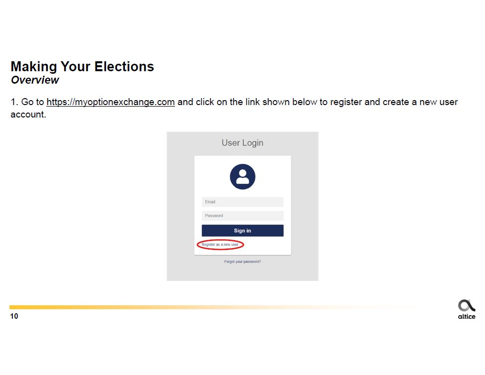 Making Your Elections Overview 1. Go to https://myoptionexchange.com and click on the link shown below to register and create a new user account. User Login Email Password Sign in Register as a new user Forgot your password? 10