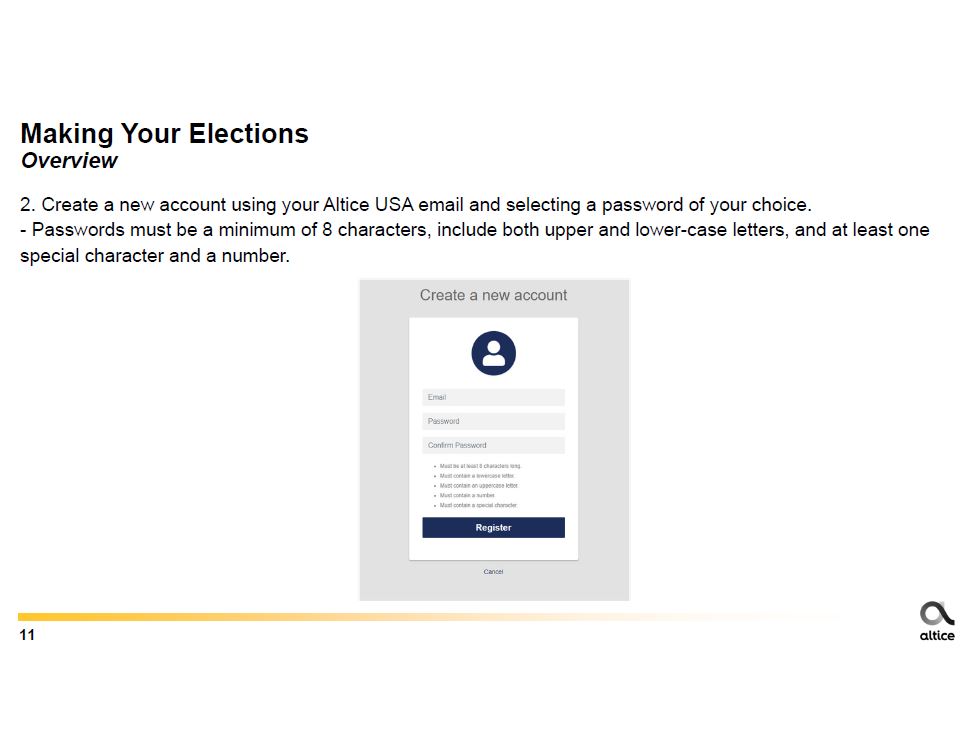 Making Your Elections Overview 2. Create a new account using your Altice USA email and selecting a password of your choice. - Passwords must be a minimum of 8 characters, include both upper and lower-case letters, and at least one special character and a number. Create a new account Email Password Confirm Password Must be at least 8 characters long. Must contain a lowercase letter. Must contain an uppercase letter. Must contain a number. Must contain a special character. Register Cancel 11