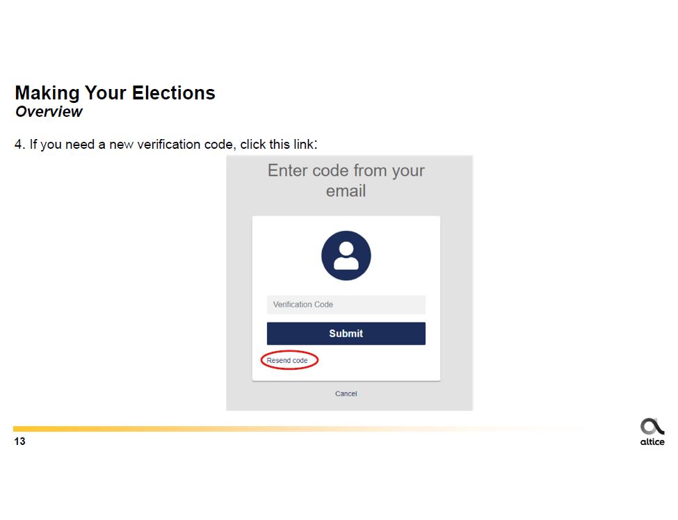 Making Your Elections Overview 4. If you need a new verification code, click this link: Enter code from your email Verification Code Submit Resend code Cancel 13