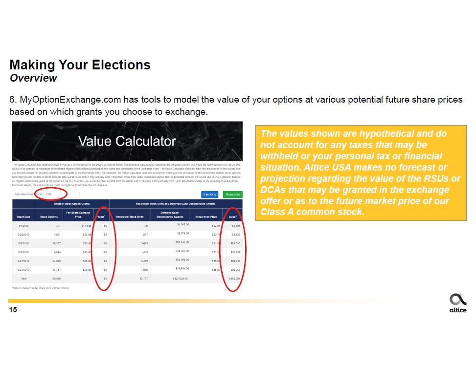 Making Your Elections Overview 6. MyOptionExchange.com has tools to model the value of your options at various potential future share prices based on which grants you choose to exchange. Value Calculator The Value Calculator has been provided to you as a convenience for purposes of making limited mathematical calculations regarding the potential amount that could be received from the RSUs and DCAs to be granted in exchange for tendered eligible stock options pursuant to the terms and conditions of the Exchange Offer. The value Calculator does not take into account all of the factors that you should consider in deciding whether to participate in the Exchange Offer. For example, the Value Calculator does not account for vesting or the remainder of the term of the eligible stock options. Note that you will be able to profit from the RSUs and DCAs only if they actually vest. Therefore, even if the Value Calculator shows that the potential profit on the RSUs and DCAs is greater than for an eligible stock option grant at the assumed prices you enter, you would be able to profit from the RSUs and DCAs only if they actually vest. Note also that because of the rounding resulting from fractional shares, the values shown could be higher or lower than the actual result. See value of awards at: 4.89 Elections Resources Eligible Stock Option Grants Restricted Stock Units and Deferred Cash-Denominated Awards Grant Date Stock Options Per Share Exercise Price Value1 Restricted Stock Units Deferred Cash-Denominated Awards Break-even Price Value1 1/1/2018 701 $17.445 $0 100 $1,002.00 $22.01 $1,491 6/28/2019 1,661 $24.08 $0 237 $2,374.00 $29.75 $3,533 8/2/2019 39,297 $25.45 $0 5,613 $56,142.00 $31.36 $83,590 8/2/2019 9,824 $25.45 $0 1,403 $14,036.00 $31.36 $20,897 9/27/2019 24,075 $29.08 $0 3,439 $34,394.00 $35.59 $51,211 9/27/2019 13,757 $29.08 $0 1,965 $19,654.00 $35.59 $29,263 Total 89,315 $0 12,757 $127,602.00 $189,984 1Value is based on the stock price entered above. The values shown are hypothetical and do not account for any taxes that may be withheld or your personal tax or financial situation. Altice USA makes no forecast or projection regarding the value of the RSUs or DCAs that may be granted in the exchange offer or as to the future market price of our Class A common stock. 15