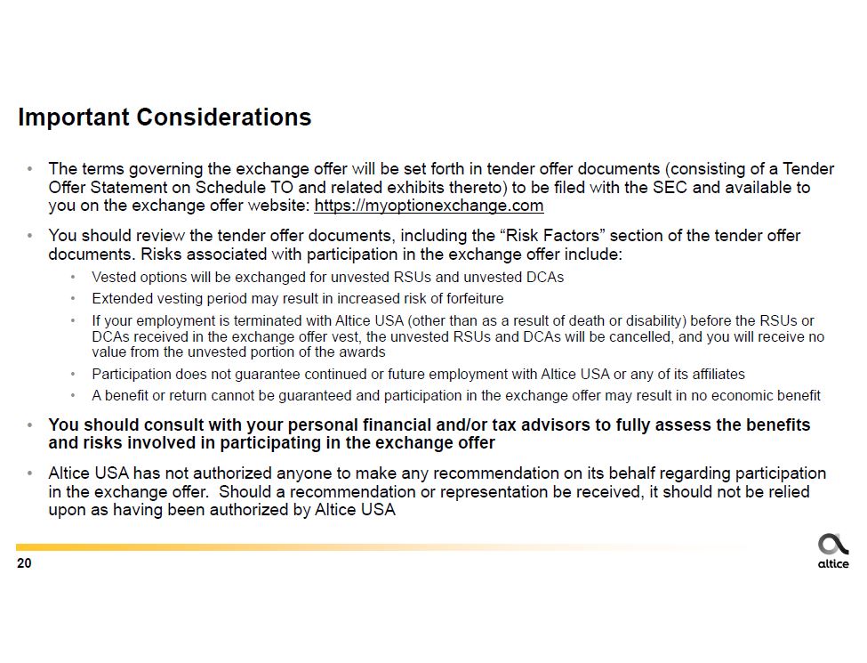 Important Considerations The terms governing the exchange offer will be set forth in tender offer documents (consisting of a Tender Offer Statement on Schedule TO and related exhibits thereto) to be filed with the SEC and available to you on the exchange offer website: https://myoptionexchange.com You should review the tender offer documents, including the "Risk Factors" section of the tender offer documents. Risks associated with participation in the exchange offer include: Vested options will be exchanged for unvested RSUs and unvested DCAs Extended vesting period may result in increased risk of forfeiture If your employment is terminated with Altice USA (other than as a result of death or disability) before the RSUs or DCAs received in the exchange offer vest, the unvested RSUs and DCAs will be cancelled, and you will receive no value from the unvested portion of the awards Participation does not guarantee continued or future employment with Altice USA or any of its affiliates A benefit or return cannot be guaranteed and participation in the exchange offer may result in no economic benefit You should consult with your personal financial and/or tax advisors to fully assess the benefits and risks involved in participating in the exchange offer Altice USA has not authorized anyone to make any recommendation on its behalf regarding participation in the exchange offer. Should a recommendation or representation be received, it should not be relied upon as having been authorized by Altice USA 20