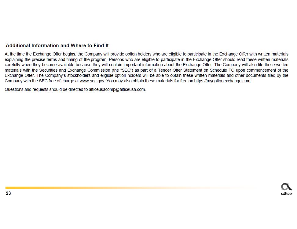 About this Presentation This employee presentation (this "Presentation") is for informational purposes only to assist interested parties in making their own evaluation with respect to Altice USA Inc.'s (the "Company") exchange offer (the "Exchange Offer"). The information contained herein does not purport to be all-inclusive and none of the Company or its respective affiliates, or any of its control persons, officers, directors, employees or representatives makes any representation or warranty, express or implied, as to the accuracy, completeness or reliability of the information contained in this Presentation. This Presentation does not constitute (i) a solicitation of a proxy, consent or authorization with respect to any securities or in respect of the proposed Exchange Offer or (ii) an offer to sell, a solicitation of an offer to buy, or a recommendation to purchase any security of the Company or any of its respective affiliates. You should not construe the contents of this Presentation as legal, tax, accounting or investment advice or a recommendation. You should consult your own counsel and tax and financial advisors as to legal and related matters concerning the matters described herein, and you confirm that you are not relying upon the information contained herein to make any decision. The distribution of this Presentation may also be restricted by law and persons into whose possession this Presentation comes should inform themselves about and observe any such restrictions. The recipient acknowledges that it is (a) aware that the United States securities laws prohibit any person who has material non-public information concerning a company from purchasing or selling securities of such company or from communicating such information to any other person under circumstances in which it is reasonably foreseeable that such person is likely to purchase or sell such securities, and (b) familiar with the Securities Exchange Act of 1934, as amended, and the rules and regulations promulgated thereunder (collectively, the "Exchange Act"), and that the recipient will neither use, nor cause any third party to use, this Presentation or any information contained herein in contravention of the Exchange Act. Forward Looking Statements Certain statements, estimates, targets and projections in this Presentation and the documents available to you in connection with the Exchange Offer may be considered forward-looking statements. Forward-looking statements generally relate to future events or the Company's future financial or operating performance. For example, statements regarding projections of the Company's future financial results and other metrics, the trading price of the Company's Class A commons stock and the terms and timing of the completion of the Exchange Offer are forward-looking statements. In some cases, you can identify forward-looking statements by terminology such as "expects", "anticipates", "believes", "estimates", "may", "will", "should", "could", "potential", "continue", "intends", "plans" and "illustrative", or the negatives of these terms or variations of them or similar terminology. Such forward-looking statements are not guarantees of future performance, results or events and involve risks and uncertainties and actual results or developments may differ materially from the forward-looking statements as a result of various factors. These forward-looking statements are based upon estimates and assumptions that, while considered reasonable by the Company and its management are inherently uncertain. Factors that may cause actual results to differ materially from current expectations include, but are not limited to: (i) the occurrence of any event, change or other circumstances that could give rise to the termination of the Exchange Offer; (ii) the outcome of any legal proceedings that may be instituted against the Company or others following the announcement of the Exchange Offer; (iii) the inability of the Company to satisfy other conditions to closing; (iv) changes to the proposed structure of the Exchange Offer that may be required or appropriate as a result of applicable laws or regulations or as a condition to obtaining regulatory approval of the Exchange Offer; (v) costs related to the Exchange Offer; (vi) the possibility that the Company may be adversely affected by other economic, business, regulatory and/or competitive factors, (vii) the Company's estimates of expenses and profitability, (viii) the evolution of the markets in which the Company competes; (ix) the ability of the Company to implement its strategic initiatives and continue to innovate its existing services; (x) the ability of the Company to satisfy regulatory requirements; (xi) other risks and uncertainties set forth in the section entitled "Risk Factors" and "Cautionary Note Regarding Forward-Looking Statements" in the Company's annual report on Form 10-K filed with the SEC on February 16, 2022 and other risks and uncertainties indicated from time to time in the offering documents related to the Exchange Offer, including those set forth under "Risk Factors" therein, and other documents filed and to be filed with the SEC by the Company. Nothing in this Presentation should be regarded as a representation by any person that the forward-looking statements set forth herein will be achieved or that any of the contemplated results of such forward-looking statements will be achieved. You should not place undue reliance on forward-looking statements, which speak only as of the date they are made. The Company does not undertake any duty to update these forward-looking statements. 22
